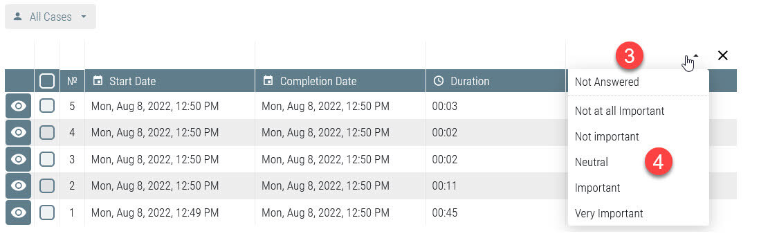 To filter columns by content, click on the column name and select the filter value (3). To edit the answer to a specific question, click on this answer (4).